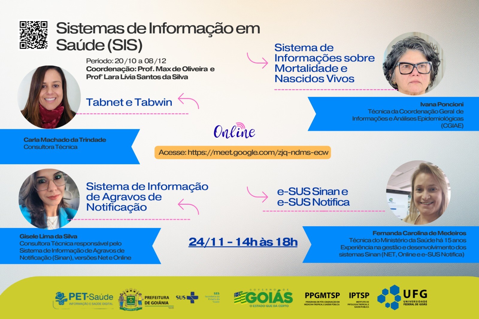 As aulas são uma iniciativa do Programa de Pós - Graduação em Medicina Tropical e Saúde Pública (PPGMTSP), da Universidade Federal de Goiás (UFG), e são gratuitas e abertas ao público. Voltadas para a temática de Sistemas de Informação em Saúde (SIS), as atividades são realizadas de maneira remota, sem necessidade de inscrição prévia e com emissão de certificado ao final.