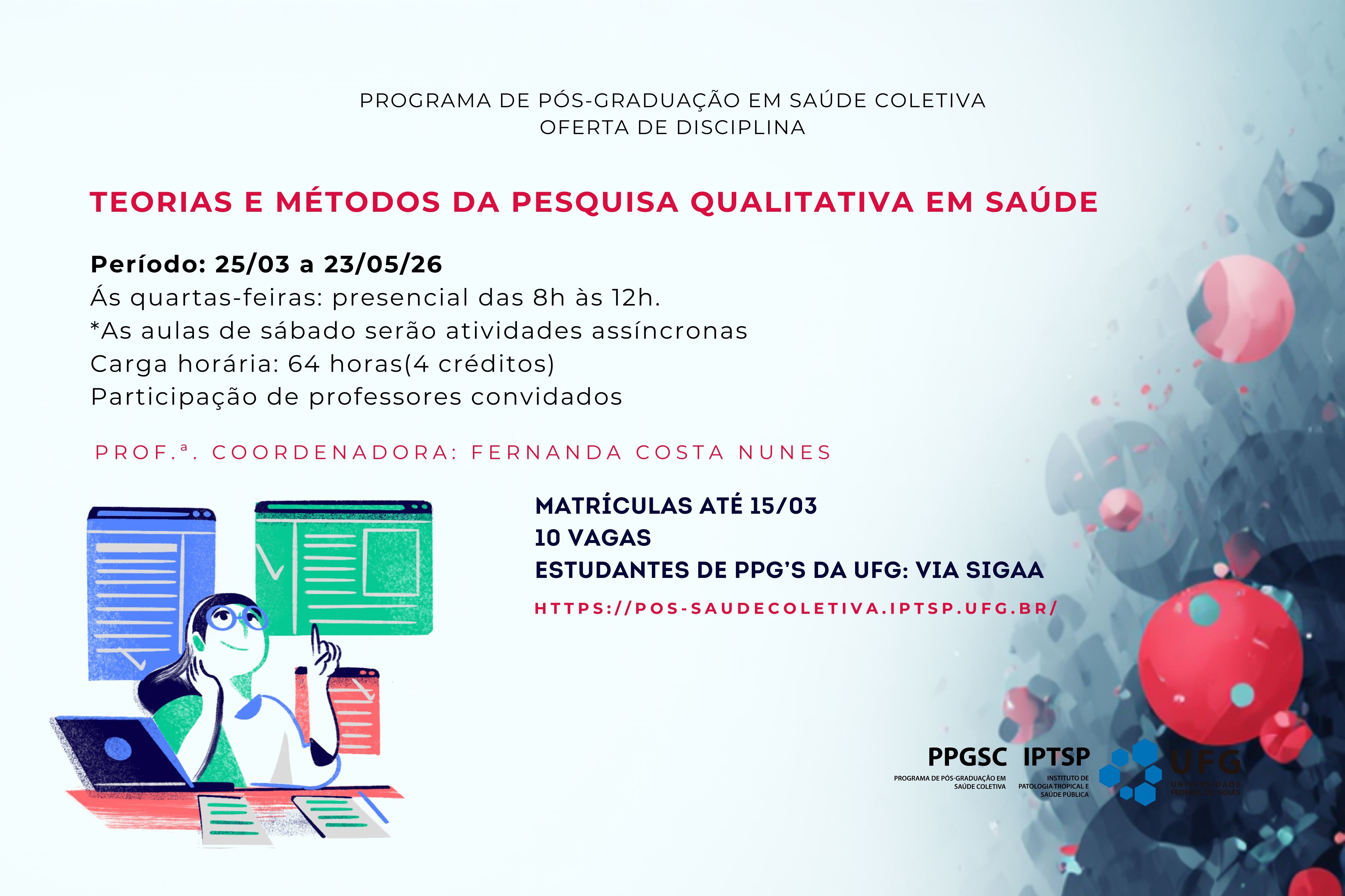 O Programa de Pós-graduação em Saúde Coletiva (PPGSC) está ofertando disciplina, coordenada pela Prof.ª do Instituto de Patologia Tropical e Saúde Pública (IPTSP), Fernanda Costa Nunes, sobre “Teorias e métodos da pesquisa qualitativa em Saúde”, da linha de pesquisa: Produção em Educação em Saúde.