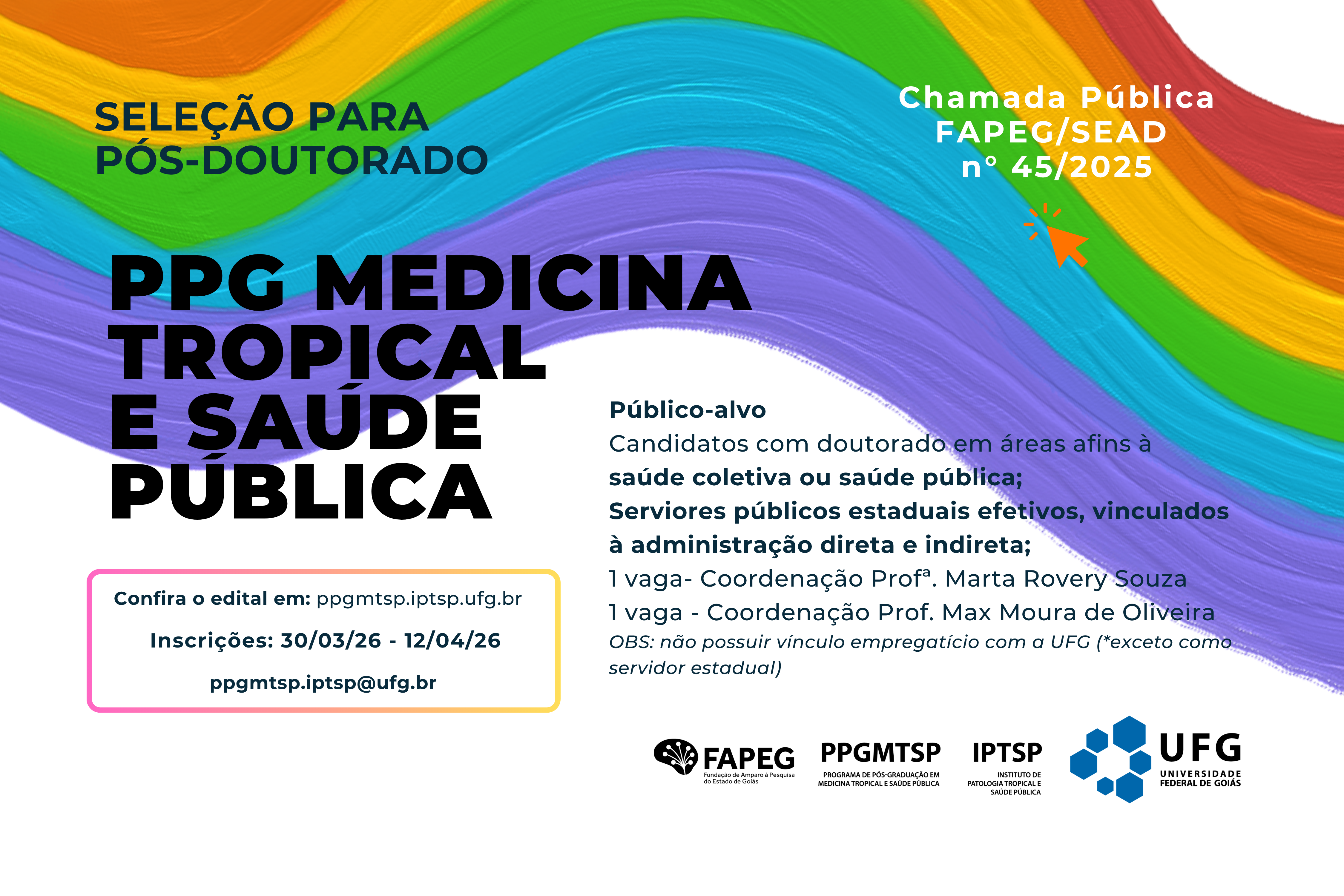 As inscrições devem ser realizadas entre 30 de março a 12 de abril de 2026, exclusivamente pelo email: ppgmtsp.iptsp@ufg.br, com o assunto "INSCRIÇÃO PÓS-DOC FAPEG 45/2025". A coordenação reforça que a leitira atenta ao edital é fundamental para o correto envio da documentação exigida, bem como as datas do cronograma.